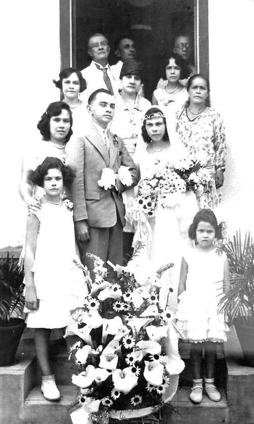 In het midden het bruidspaar, mijn opa Charles Johan Leonard, geboren op 23 maart 1904 te Batavia en mijn oma Toety Kuhr, geboren 7 oktober 1911 te Meester Cornelis.