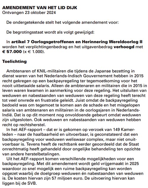 23 okt ingediend: Amendement van het lid Dijk over een ruime backpayregeling voor weduwen en nabestaanden van weduwen van ambtenaren of KNIL-militairen die tijdens de Japanse bezetting in dienst waren van het Nederlands Indisch Gouvernement.