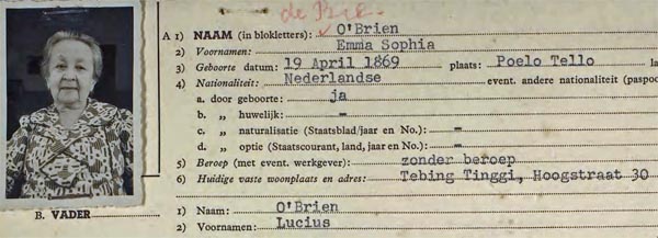 Dit is de scan is van de paspoortaanvraag van Emma Sophia O’Brien. Geboren in 1869 op het eiland Poelo Tello, Bantoe-eilanden voor de kust van West-Sumatra. Ze overleed in 1954 in Utrecht. In de periode 1923 -1932 woonde ze in Den Haag met haar echtgenoot Johan Carl de Bie (1863 Soerabaja-1932 Den Haag) met wie ze huwde in 1889 te Batavia. Johan was employee van de rekenkamer in Batavia voor zij naar Nederland vertrokken ca 1916.