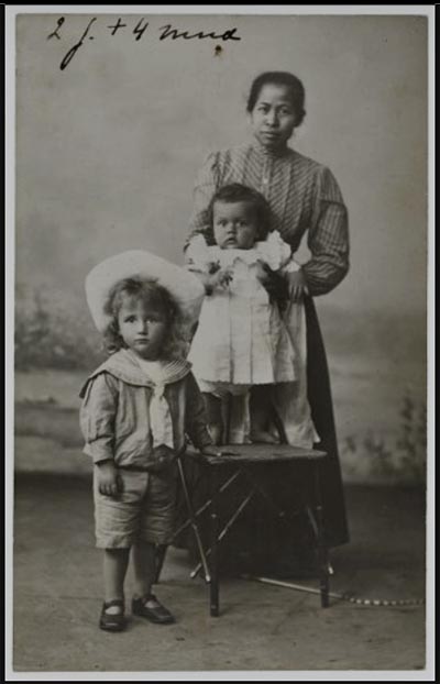 De vijf hier in de aarde rustenden waren geboren en getogen in Nederland. Misschien waren ze ooit in Indië geweest, maar dan voor een korte tijd. Toch blijkt de band met Indië van de familie van den Bosch uit deze foto van 1908. De staande zoon met hoed is Johannes Hendrik Otto vd B.(1906). Vermoedelijk was dit in Den Haag en was de baboe met zijn grootouders meegegaan naar Nederland ? Of pas in dienst gekomen te Den Haag ?