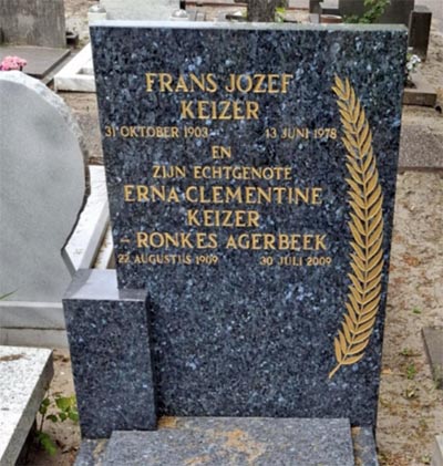 Het graf te begraafplaats Nieuw Eykenduynen in Den Haag. Ouders van Frans Keizer waren Willem Carel Keizer (1871 Banjoemas-1956 Soerabaja), commies van de staatsspoorwegen en Emma Sophia de Cray (1880 Poerwakarta-1933 Malang). Frans was commies op een residentiekantoor toen hij gemobiliseerd werd . En zodoende was hij krijgsgevangene in 1942.