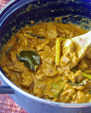 Rendang ayam, niet ajam. Is redelijk populair in de Padang restaurants, eigenlijk gewoon hetzelfde gerecht met dezelfde saus maar ander vlees. Borst filet (dada) geeft een andere smaak dan de dij (paha). Men kan zelfs een babi versie maken, die ook minder lang moet opstaan.