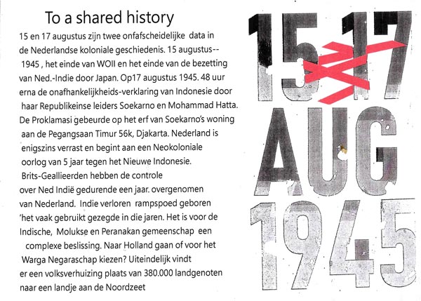 De data van 15 en 17 augustus, zoals de geachte Heer Theo Stücken heeft benadrukt, zijn twee oafscheidelijke data in de Nederlandse geschiedenis. Nederland werd overvallen door deze uiting van Indonesisch nationalisme en beschouwde het als een interne aangelegenheid, waarop het naar moderne begrippen een ‘Speciale Militaire Operatie’ startte. Dit markeerde echter het begin van het einde van de Nederlandse bezetting.
