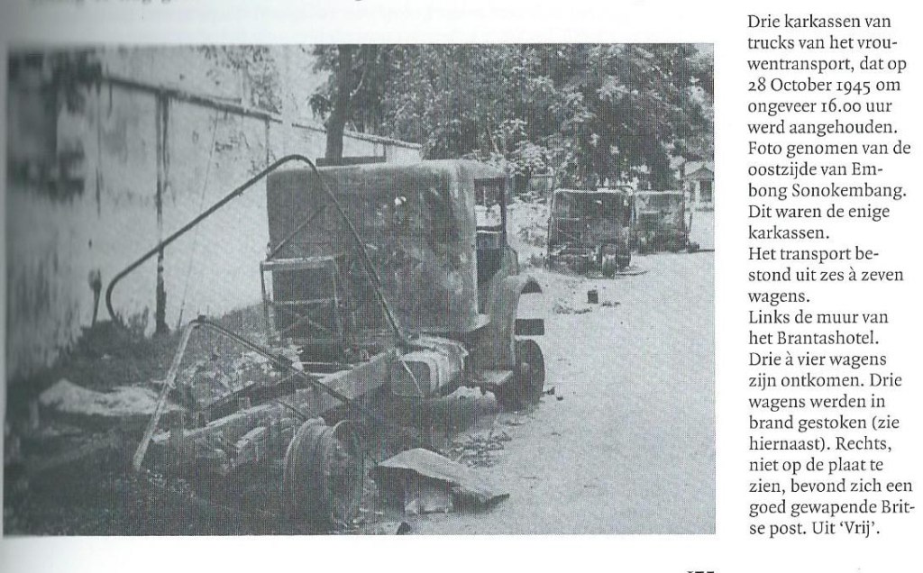 Evacuatie Nederlanders In 3 achtereenvolgende colonnes met legertrucks werden voornamelijk Nederlandse vrouwen en kinderen geëvacueerd, die op weg waren naar veiliger gebieden. Met name het laatste transport kwam zwaar onder vuur te liggen van Indonesische pemoeda’s. Van de vrouwen en kinderen die in de vrachtwagens zaten, kwamen er 150 om. Velen raakten gewond