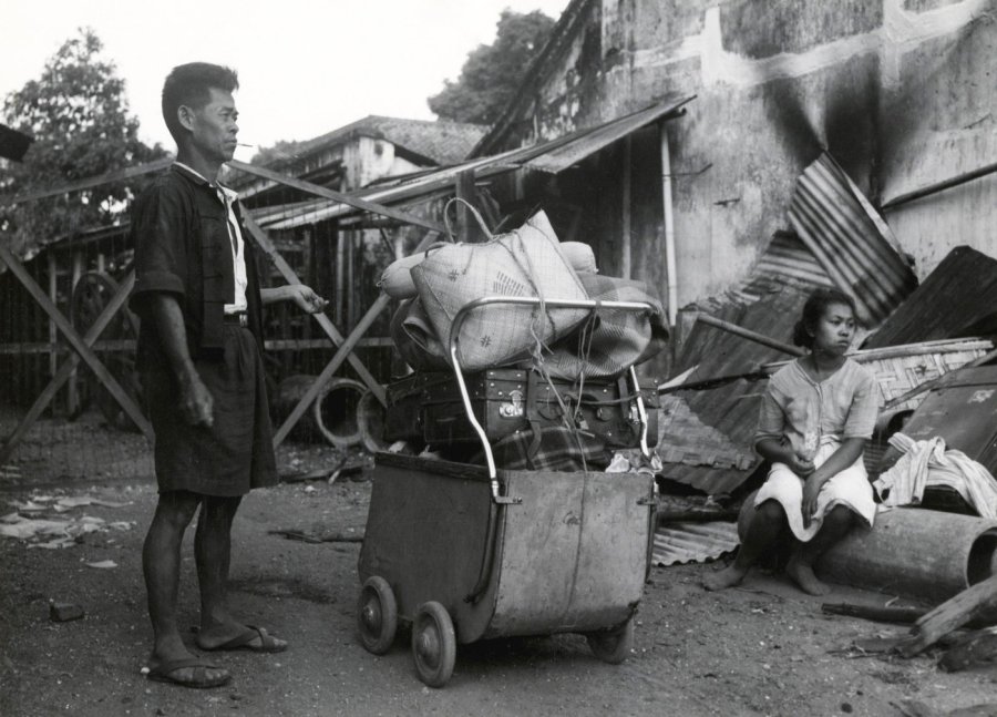 Javaanse vluchtelingen met hun schamele bezittingen in een kinderwagen keren terug in het verwoeste Tjilatjap tijdens de eerste politionele actie op Midden-Java Indonesië, circa 28 juli 1947.