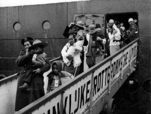 Toen we dachten dat de oorlog in 1945 afgelopen was begon de Bersiap periode. We beefden van angst en elke dag werden er hollanders vermoord en in de kali dicht bij ons huis geworpen. Mijn moeder kleedde ons met sarong en kabaja en in de voorkamer heeft Tania Chelly een grote Rood-witte vlag opgehangen. Men hoorde op de straat de pemuda’s schreeuwen, Merdeka! Merdeka! Mijn vader die het kampleven onder de Japanners overleefde moesten we verstoppen. Hij hield veel van Java waar hij 25 jaar had gewoond en toen besloot hij naar Nederland met zijn familie weg te gaan. Hoe hij alles voor elkaar kreeg weet ik niet maar op een dag gingen we allen naar het schip de “Nieuw Holland” die ons naar Amsterdam zou brengen en van daar naar onze Nederlandse oma, die we niet kenden, naar een land dat voor ons vreemd was. We vertrokken de 16e December 1946 en kwamen na een maand in Januari 1947 in Amsterdam aan. De reis was voor mij een verschrikking. Er waren meer dan 1000 mensen aan boord en wij meisjes moesten in het vrouwenruim slapen en mijn vader met mijn boertjes in het mannen ruim. De hele reis was ik zeeziek en af en toe haalde mijn vader me naar boven op het dek want ik moest vliegende vissen zien. Of in Aden een tovenaar die ons kuikentjes uit onze blouse toverde.