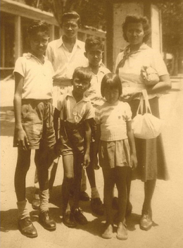 Van links naar rechts, Oom Louis, man van jongste zus van mam, Gerda, die hier geheel rechts staat. Naast oom Louis staan ik en mijn man Stawros, daarnaast mijn vader en tante Chelly, zus van mam, en naast haar mam. Het kind was van een jongere broer van mam die zijn moeder overleed, Jackie werd door Gerda aangenomen