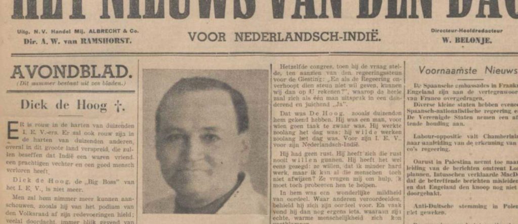 Bij de verkiezingen dacht ik aan die ene Indische beroemde politicus uit de jaren 1930: Dicky de Hoog, de geliefde voorzitter het het Indo-Europees Verbond (IEV).Wie kent hem nog?Die vraag zal ik anders stellen: wie heeft van zijn of haar ouders iets over hem gehoord?Want Dicky de Hoog stierf in 1939.