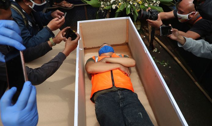 Mensen die in de Indonesische hoofdstad Jakarta worden betrapt zonder mondkapje, kunnen als straf ongeveer een minuut in een doodskist gaan liggen. De autoriteiten bedachten de ongebruikelijke maatregel, omdat ze mensen willen dwingen goed na te denken over de gevolgen van hun daden. AD.nl